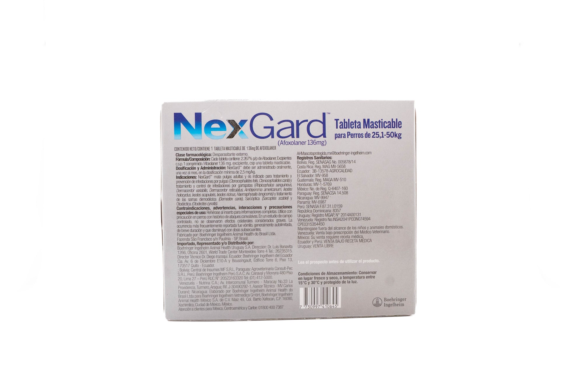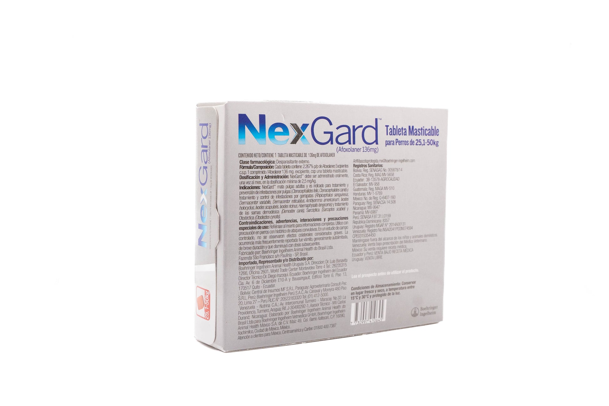 NexGard es una tableta masticable sabor carne indicada para perros de 25,1 a 50 kg.